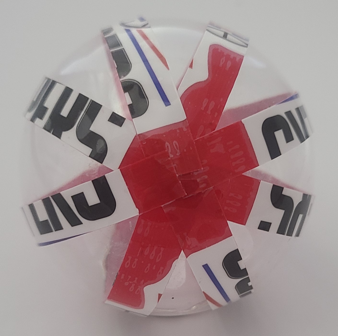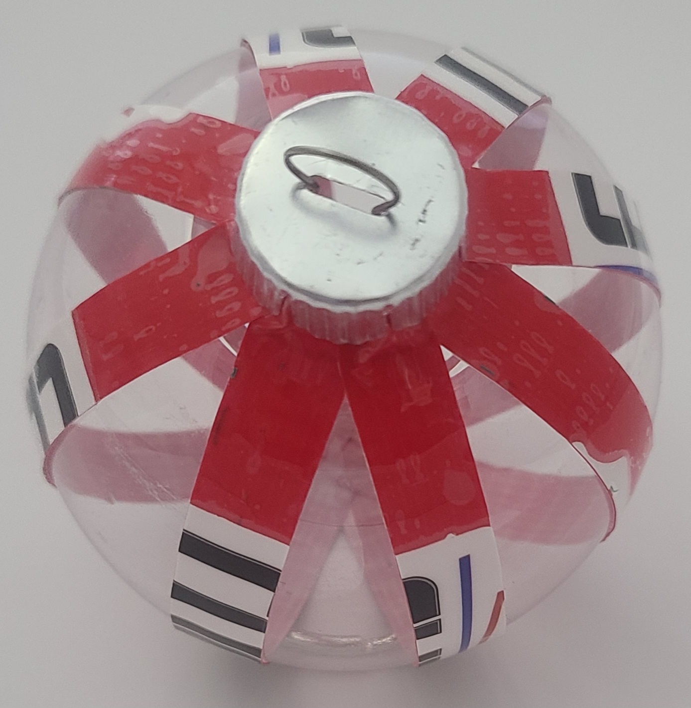 These handmade ornaments are approximately 2 3/4″ in diameter. They are made of plastic, covered in duct tape, sticker, and clear tape. Hangs from a regular ornament hook. The perfect addition to your Christmas tree!