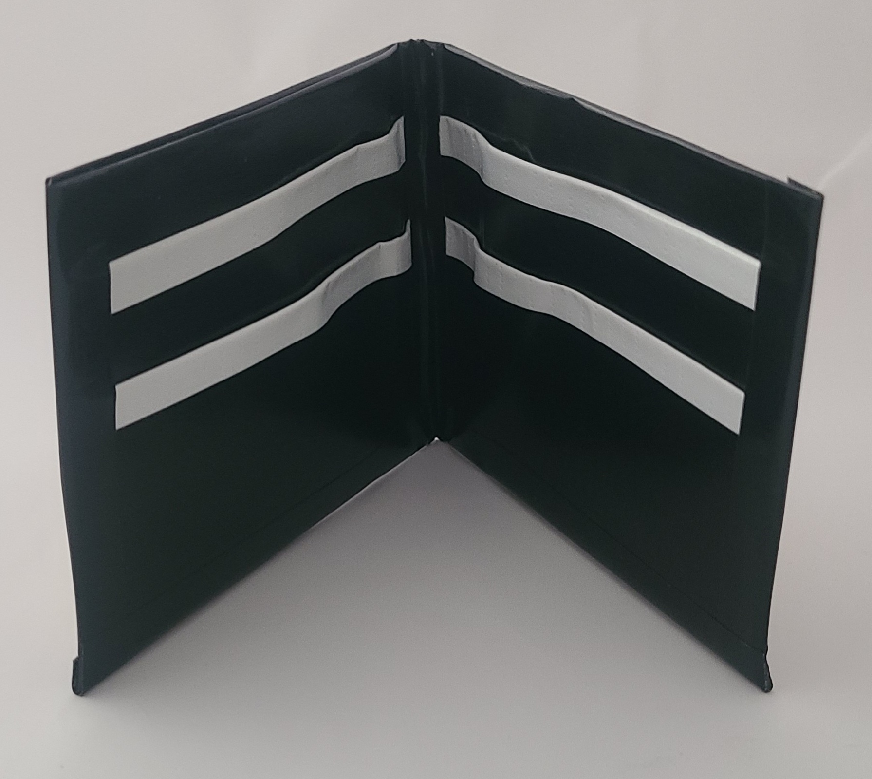 This bi-fold wallet measures approximately 8.5″ x 4″ when laid open and flat (4.25″ x 4″ when folded). Each wallet has four slots for cards, and one large slot for cash. Accent color shown in picture will be the one sent, unless the purchaser otherwise requests. Item is made completely out of duct tape. I only use the very best brand for my customers: Duck Brand tapes.  Front of wallet is accented with a sticker and covered with clear tape for protection.