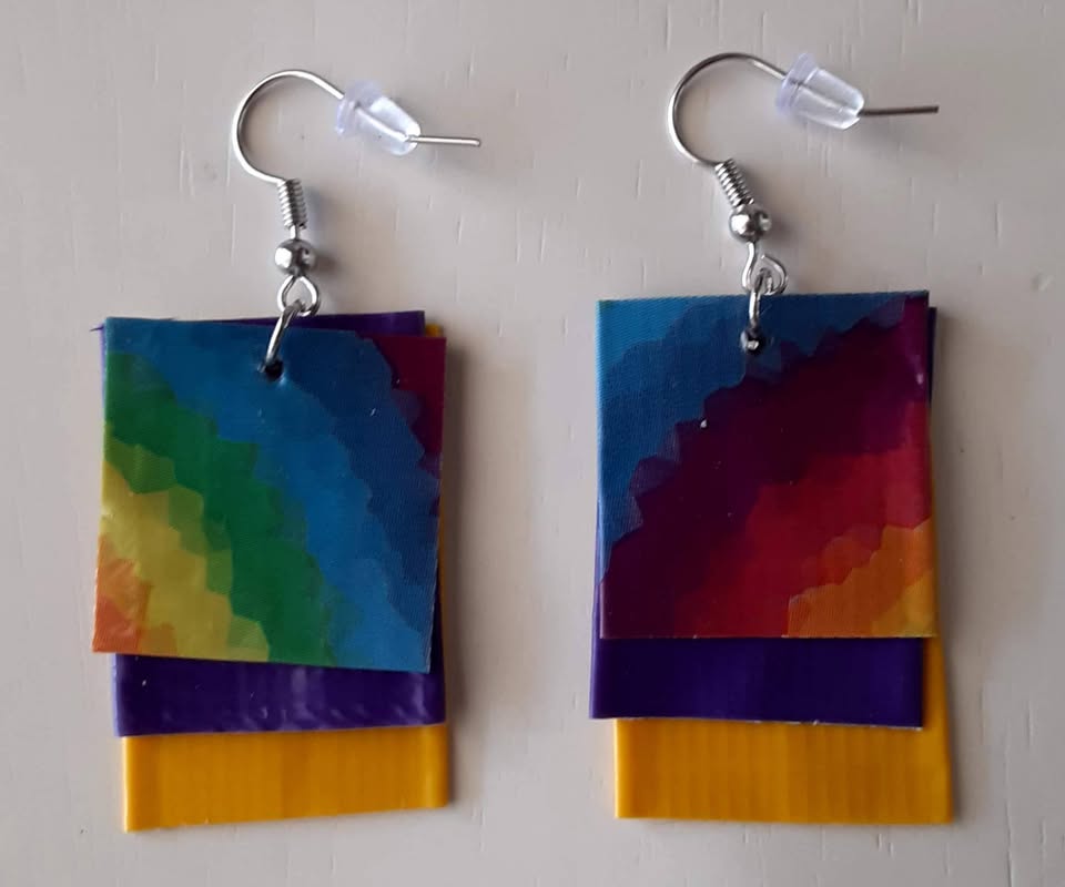 These accessories are sure to get noticed! Made out of duct tape, these triple-layered earrings are a great way to show of your favorite character or team! The earrings measure approximately 1″ wide by 1.5″ long (not including the hooks). I use the hooks that are sold at hobby lobby. They are mixed metal. The earring hooks also include silicone earring back, so you don’t lose those earrings. Due to the handmade nature of this item, it may look slightly different than that shown in the picture. See pictures for front and back view, as well as what the earrings look like when worn.