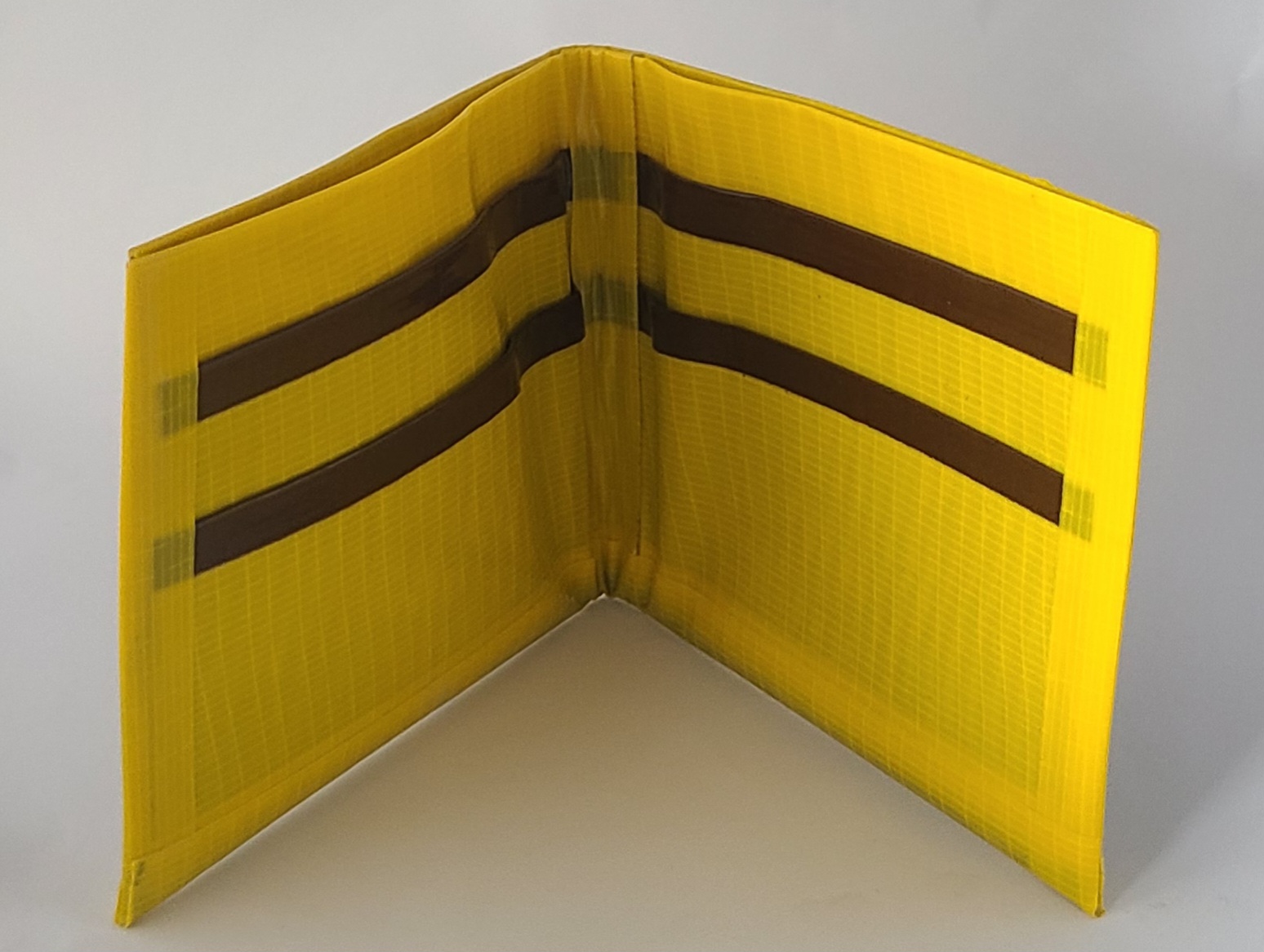 This bi-fold wallet measures approximately 8.5″ x 4″ when laid open and flat (4.25″ x 4″ when folded). Each wallet has four slots for cards, and one large slot for cash. Accent color shown in picture will be the one sent, unless the purchaser otherwise requests. Item is made completely out of duct tape. I only use the very best brand for my customers: Duck Brand tapes.  Front of wallet is accented with a sticker and covered with clear tape for protection.